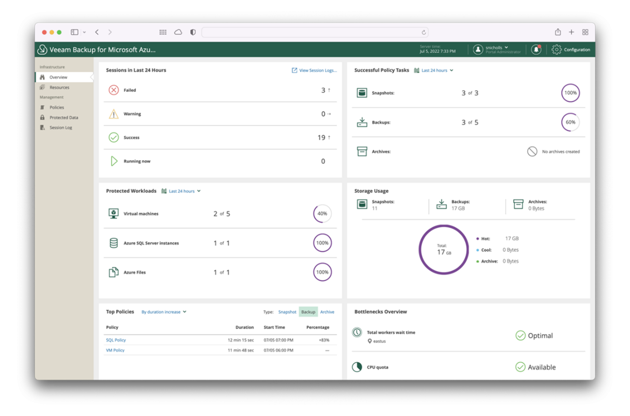 O Veeam Backup for Microsoft Azure está com um painel completamente novo. Esse painel fornece informações rápidas para aprimorar ainda mais o gerenciamento do ambiente de backup.