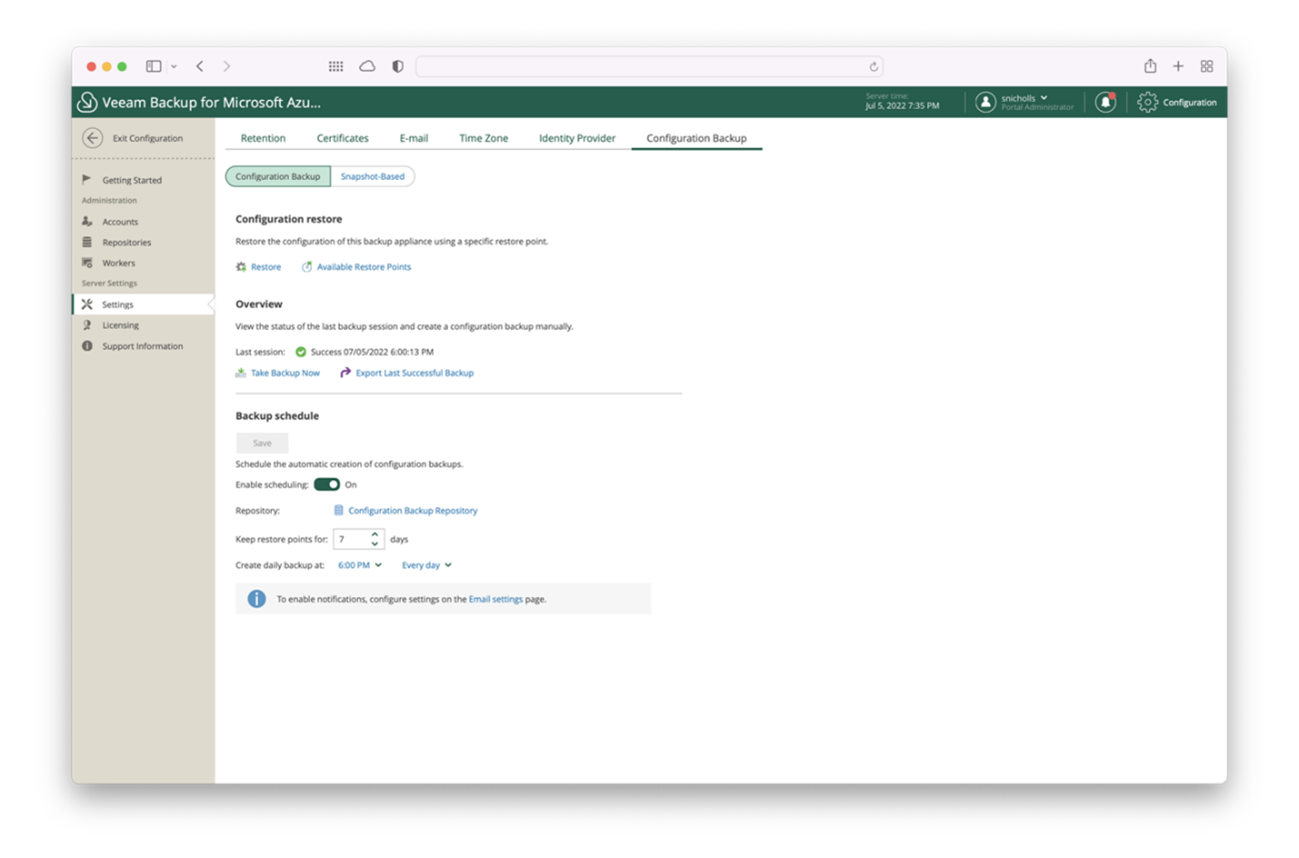 À medida que o uso do Veeam Backup for Microsoft Azure aumenta, garantir que a configuração do próprio dispositivo seja protegida e recuperável também é fundamental. Com a versão v4, você pode fazer o backup de todas as definições de configuração — incluindo itens como políticas — e recuperá-las em caso de exclusão acidental, desastre, migração e muito mais.