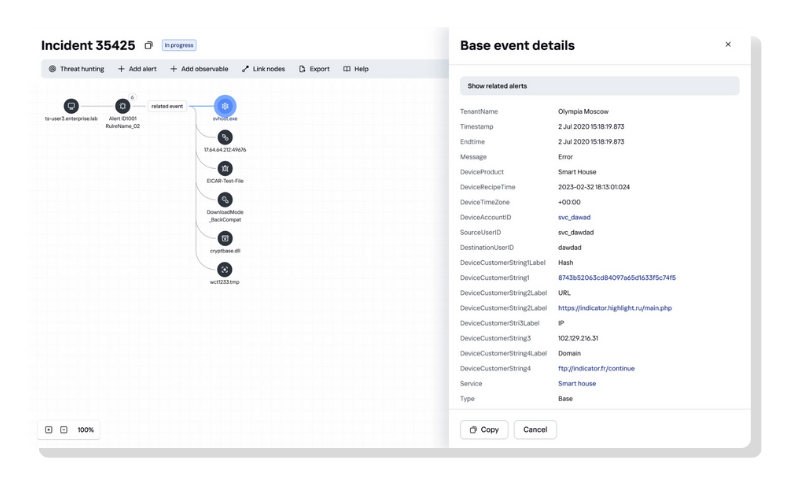 Gerenciamento de casosO Kaspersky XDR permite gerenciar alertas de forma eficaz, investigar incidentes e coordenar fluxos de trabalho colaborativos. Os usuários podem triar alertas, enriquecer dados, acionar manualmente ações de resposta e marcar incidentes usando a matriz MITRE ATT&CK. |